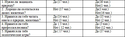 Анализируя результаты двух анкет, хочется сказать, что результаты в основном одинаковые в обоих группах. Они любуются природой, но все-таки разводят костры, ломают ветви на шалаш, позволяют себе рвать цветы. Для дошкольников доступны понятия хороших и плохих поступков. Под хорошим поведением они подразумевают прилежное отношение к учебе, полезный труд, соблюдение элементарного порядка, проявление вежливости, дружбу со сверстниками, честность и правдивость ...