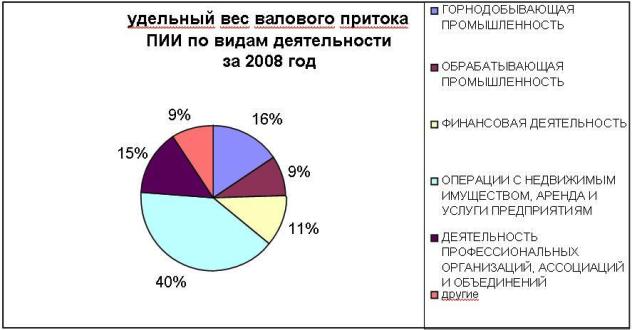 ...Следует отметить значительное увеличение объема ПИИ, в обрабатывающую промышленность на 65% (2007 год – 1 061,2 млн. долл., 2008 год – 1 756,5 млн. долл.), что составляет 9 % от общего валового притока ПИИ по видам деятельности, и увеличение по отношению к предыдущему году на 2,6 %, в том числе в черную металлургию (в 19 раз) обусловлено признанием реинвестированных доходов инвесторов.