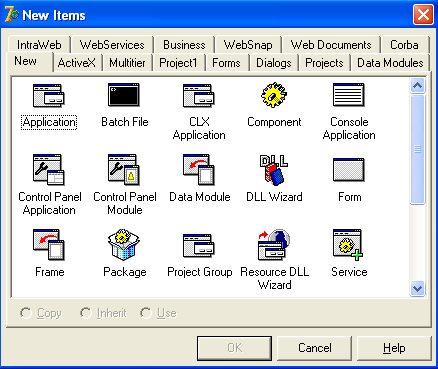 Borland Delphi7 ортасында сәйкесі программаны құру үшін алдымен оны пайдаланушының компьютеріне орнату керек. Сосын Delphi редакторының басты менюінднгі: File (Файл)/New (Жаңа)/ Other (Басқа) операцияларды орындаймыз, нәтежесінде Delphi ортасында (2.11-сурет) жаңа жоба құру шеберінің диалогты терезесі ашыла.