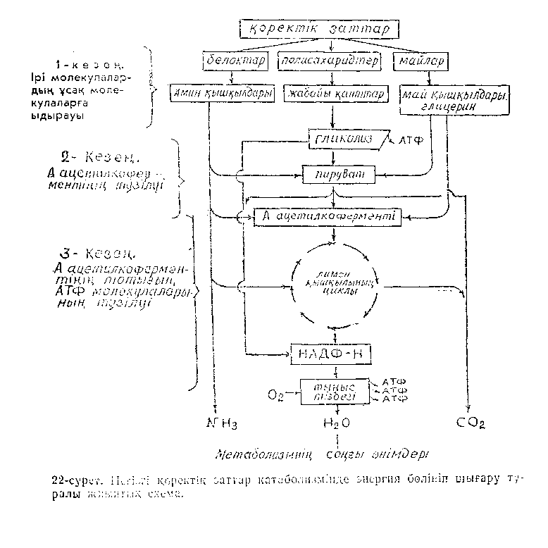 Енді қоректік заттар ыдырауьның заңдылығын түсіну үшін, осы реакцияларды тұжырымдап қорытаиық. Катаболизм схемасын қорыту мынаны көрсетеді (22-сурет): энергиясы бар әр түрлі заттардың молекуласы біртіндеп, үш кезеңде ыдырайды және олардың нәтижесінде бір ғана аралық өнім — А ацетилко фермент түзіледі.