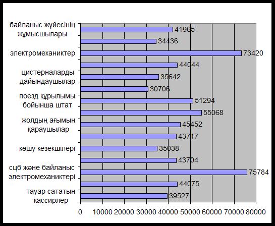 Келесі 3 – диаграммада негізгі өндірістік топтардың орташа айлық жалақысы келтірілген, 30706теңге вагон шаруашылығының жөндеушілеріне және 75784теңге СЦБ және байланыс электромеханиктеріне тиесілі.