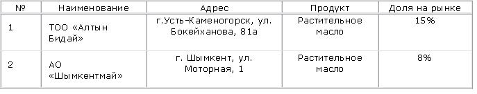 Основных конкурентов ТОО «Табыс» по реализации продукции в Казахстане можно условно поделить на две группы: фирмы-импортеры и отечественные производители. В Казахстане два основных конкурента масла – ТОО «Алтын-Бидай», АО «Шымкентмай». Наряду с этими двумя крупными имеется множество мелких с общим объемом ежегодной продукции около 15000 тонн.