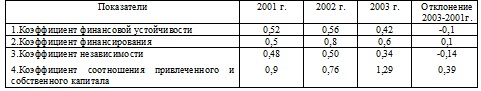 Как видно из данных таблицы, в 2003 году основные коэффициенты финансового состояния ниже данных предыдущего 2002 года и несколько ниже данных 2001 года. Кроме коэффициента соотношения привлеченного и собственного капитала невысокий и к тому же снижается коэффициент независимости свидетельствует что большая часть имущества сформирована не за счет собственных, а за счет заемных средств. Об этом же свидетельствует коэффициент финансирования равный в 2003 году 0,6.